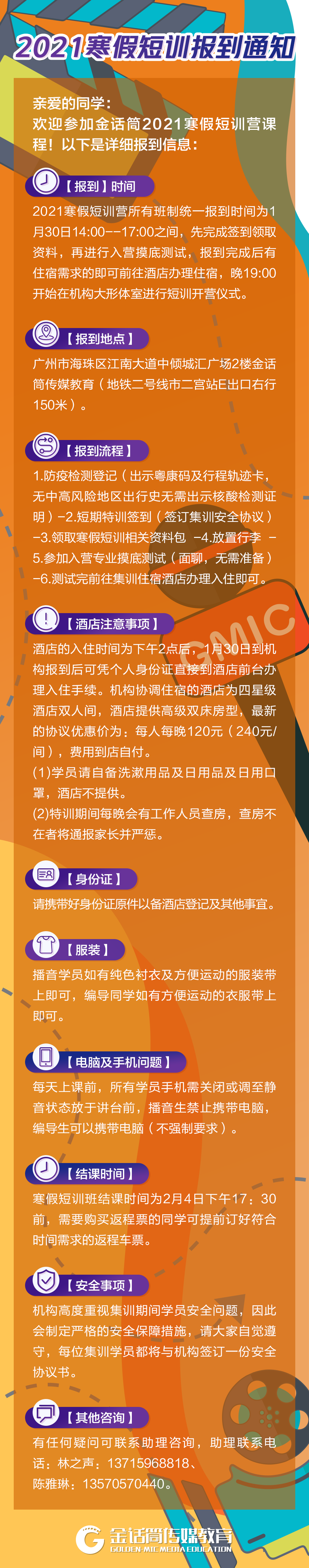 这次课程我们将继续保持高能斗志,走入播音、编导专业的世界中,体验各大考试科目的教学,挖掘每个人的专业特性。下方长图是报到须知详细信息,请大家下载查收,明儿下午14:00--17:00任意时间报到即可哦,明天见!
