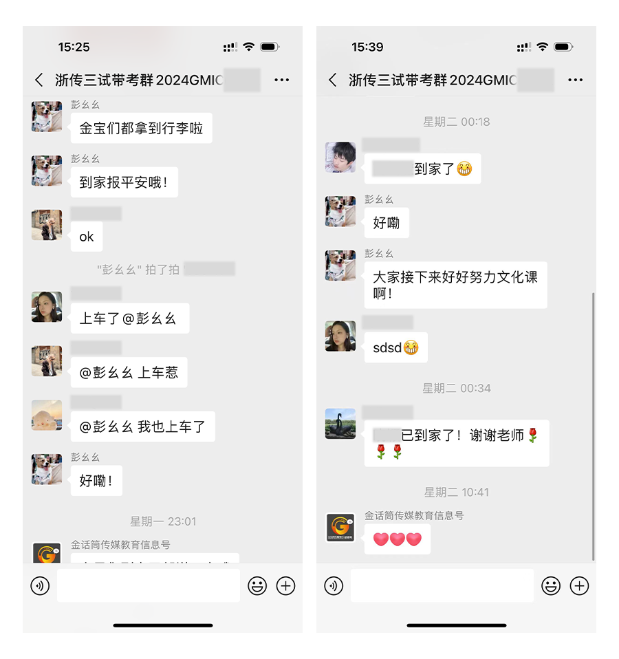 待到考完返程,宝子们不忘小金老师和带队老师的叮嘱,回家后在带考群内报平安,给线下校考的旅程画上一个安全的句号。